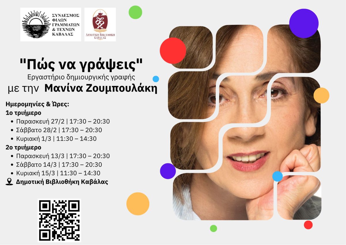 Ο Σύνδεσμος Φίλων Γραμμάτων και Τεχνών (Σ.Φ.Γ.Τ.) Καβάλας και η Δημοτική Βιβλιοθήκη Καβάλας “Βασίλης Βασιλικός” οργανώνουν εργαστήριο δημιουργικής γραφής με εισηγήτρια την Καβαλιώτισσα συγγραφέα Μανίνα Ζουμπουλάκη και θέμα “Πώς να γράψεις”, το οποίο θα διεξαχθεί στον χώρο της Δημοτικής Βιβλιοθήκης.